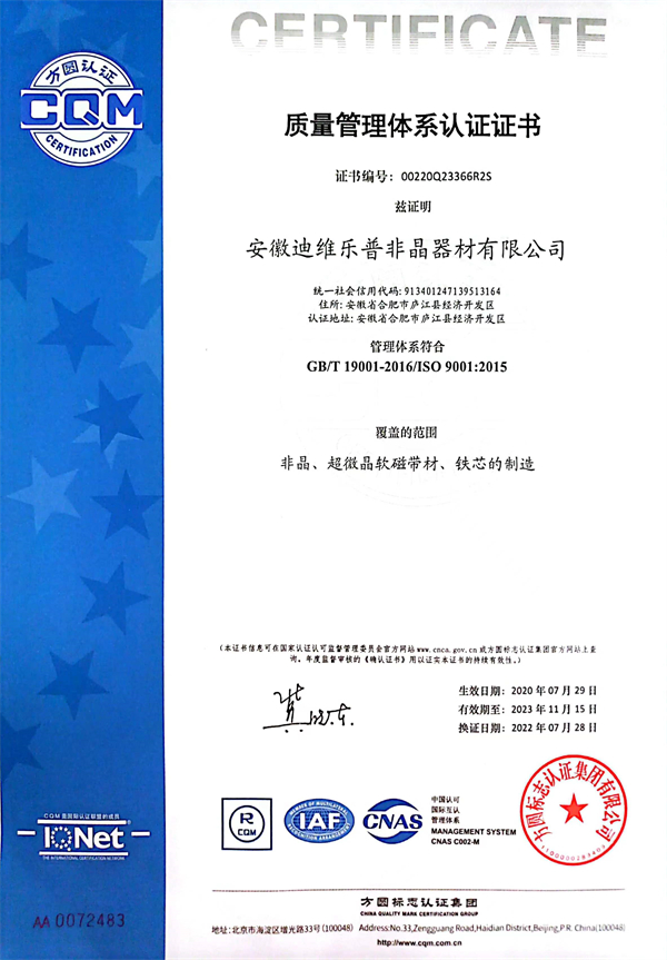 為響應(yīng)國(guó)家標(biāo)準(zhǔn)化發(fā)展綱要,推動(dòng)高質(zhì)量發(fā)展,建設(shè)社會(huì)主義現(xiàn)代化國(guó)家。 安徽迪維樂(lè)普非晶器材有限公司、非晶合金電力互感器材料研究中心;為促進(jìn)標(biāo) 準(zhǔn)化發(fā)展、提升標(biāo)準(zhǔn)化水平;實(shí)現(xiàn)企業(yè)有序發(fā)展、有規(guī)可循;產(chǎn)品質(zhì)量有據(jù)可依、 方便客戶甄別選用,特制定本企業(yè)質(zhì)量標(biāo)準(zhǔn)。